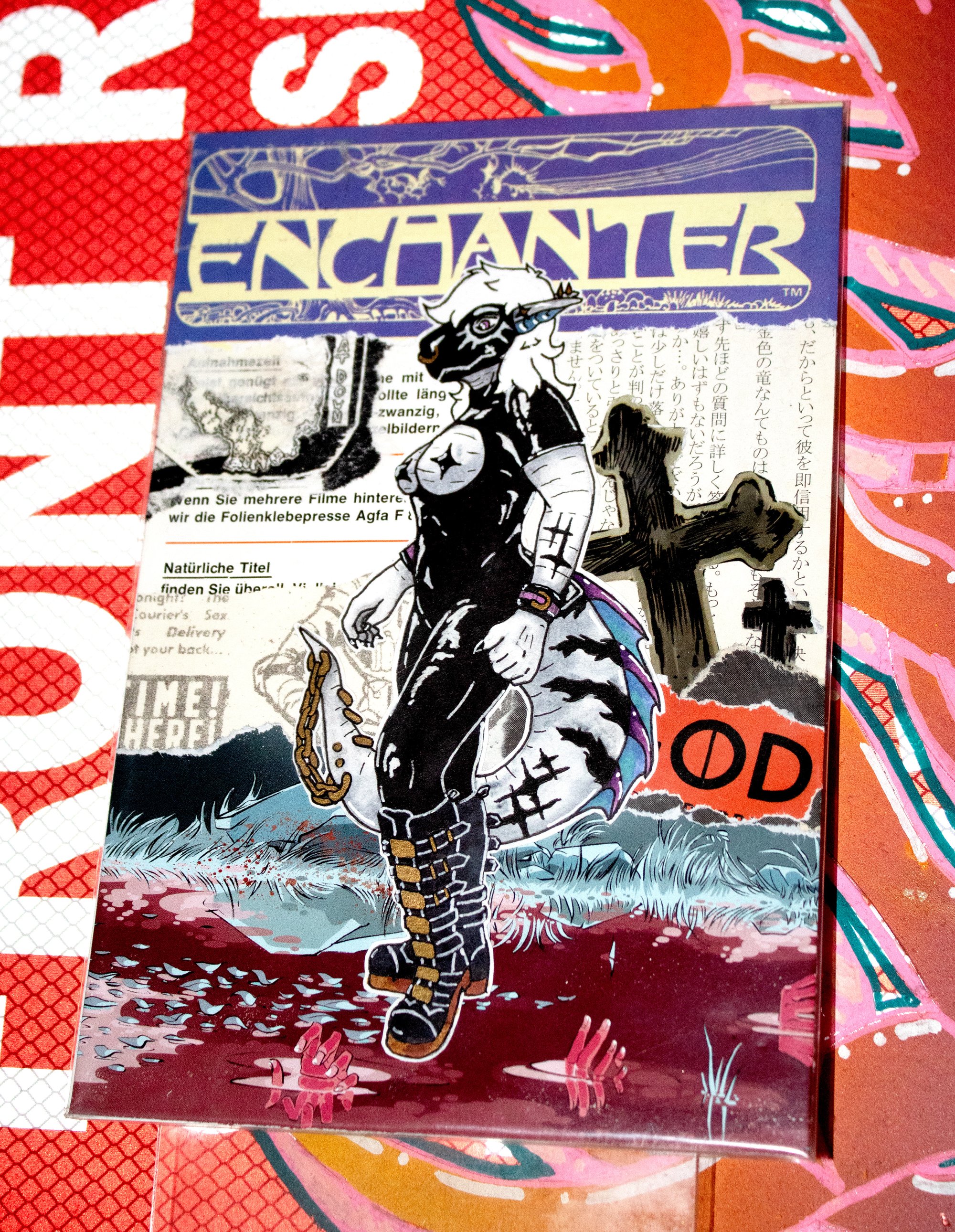 A multi media collage piece featuring the lovely Mrs. Mon Dieu! Veiled in sleek rubber and studded mask. This dragon will teach you a thing or two.