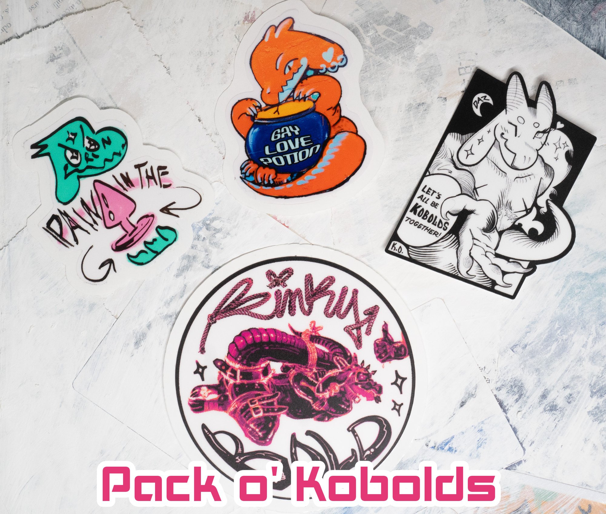 Pack o' Kobolds - 4 sticker bundle including Pain in the Ass, Gay Love Potion, Let's be Kobolds Together!, Kinky Bold