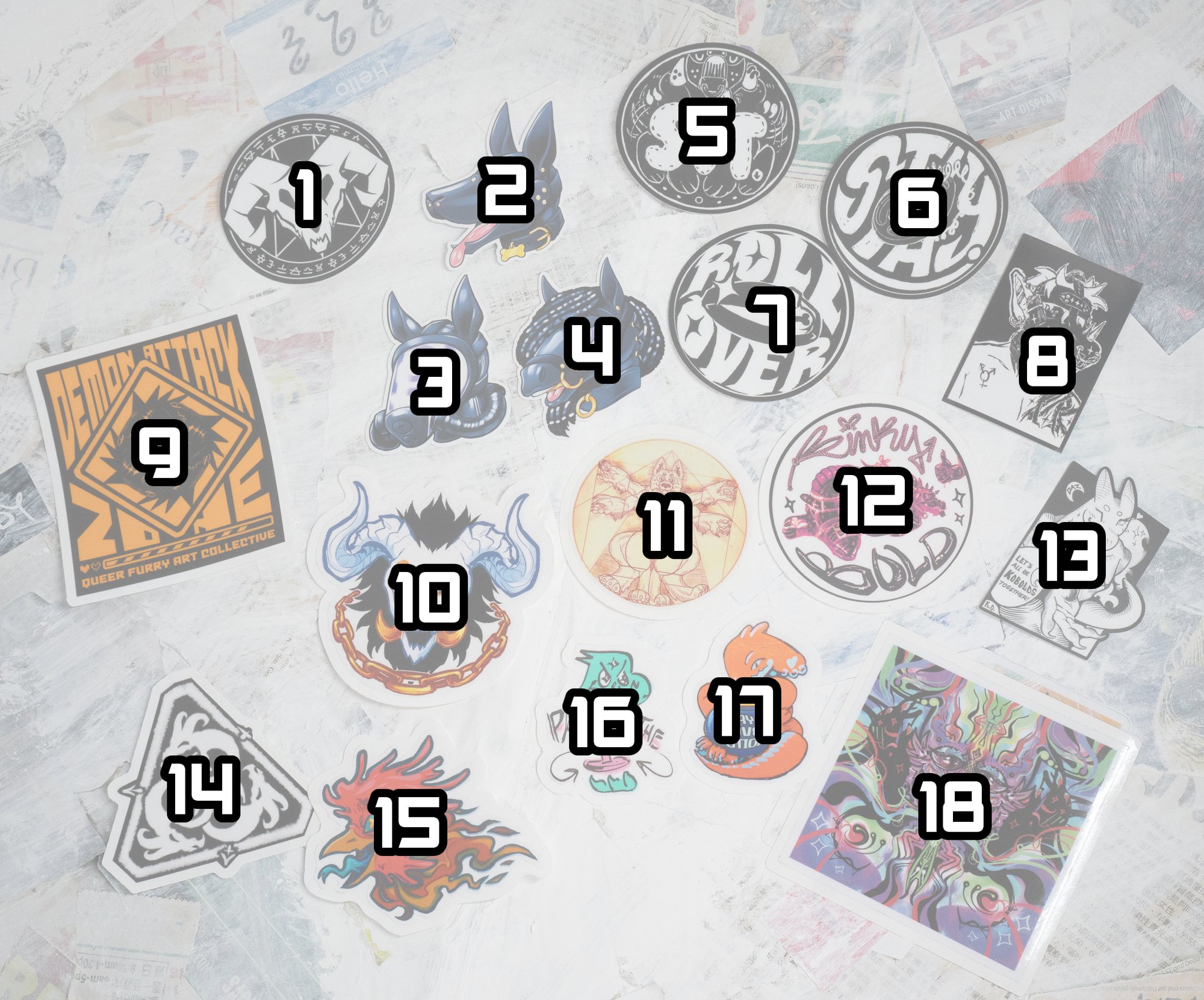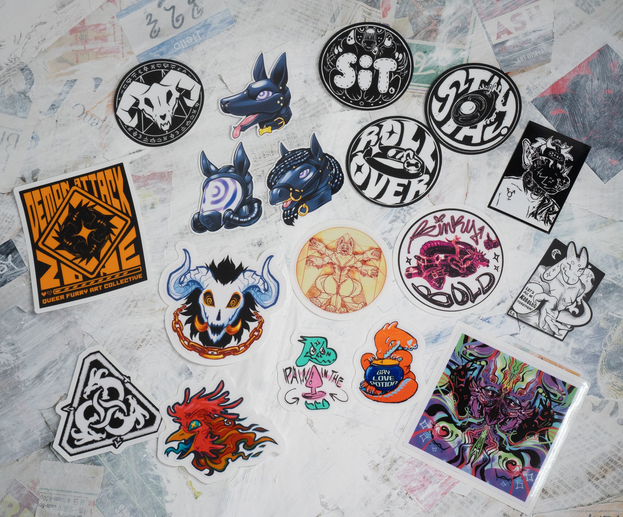 Die-cut vinyls stickers with designs from the artists of Demon Attack Zone
